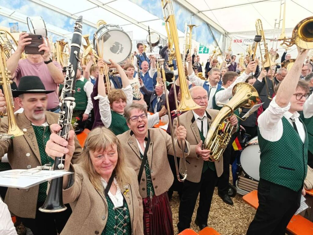 Schon zu Beginn versammelten sich rund 1.600 Musikerinnen und Musiker aus 48 Kapellen im Festzelt, um gemeinsam den Kreisverbandsmarsch, die deutsche Nationalhymne sowie das vom Gastgeberverein gestiftete Stück „Auf uns“ zu spielen. Der gewaltige Gesamtklang sorgte für Gänsehaut und ein starkes Gemeinschaftsgefühl – ein Moment, den keiner der Beteiligten so schnell vergessen wird.