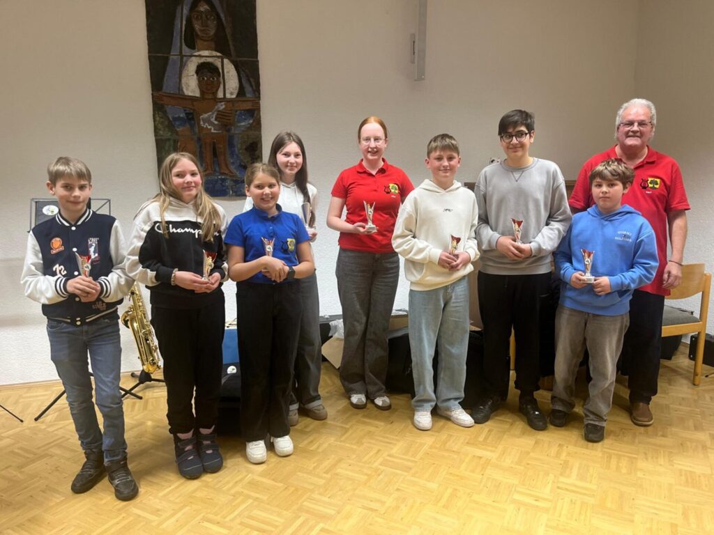 Jugendleiterin Elise Link und Karl Jung überreichten den Kindern der Bläserjugend einen Pokal als Anerkennung für ihren Einsatz im vergangenen Jahr.