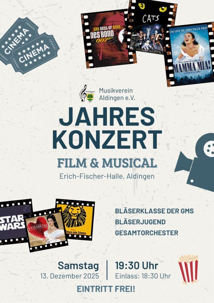 Die Vorbereitungen laufen auf Hochtouren – denn am Samstag, 13. Dezember 2025, lädt der Musikverein Aldingen e.V. zum großen Jahreskonzert ein. Unter dem Motto „Film & Musical“ erwartet Sie ab 19:30 Uhr (Einlass: 18:30 Uhr) ein abwechslungsreicher Abend in der Erich-Fischer-Halle Aldingen.